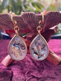 Peacock abalone shell pieces with a shimmery white background in Teardrop shape and holographic rays on the back. Set in gold filled hypoallergenic findings.