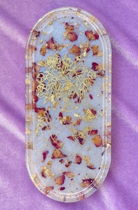 Non-toxic Resin, mica powders, gold leaf, rose petals and love.