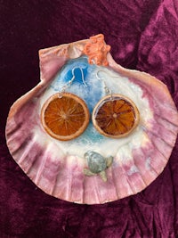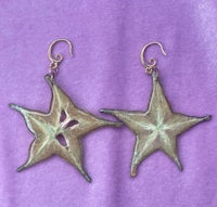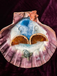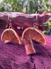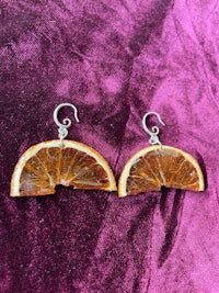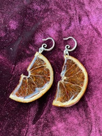 Whole slices of exotic Starfruit, Hand dried and preserved in Resin. They look so juicy and cute, like stained glass in the sun. Set in spiral gold plated hypoallergenic findings.