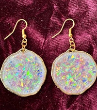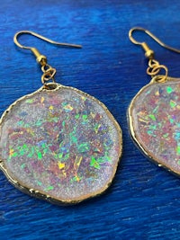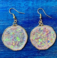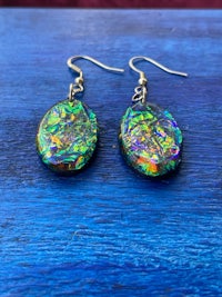 Dicro is a term used in glass blowing to signify the beautiful sparkly, color shifting glass. Here the Dicro method is mimicked with color shifting paper and resin to create these iridescent, opalescent combination of colors. Set in gold filled hypoallergenic findings.