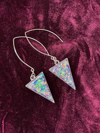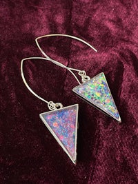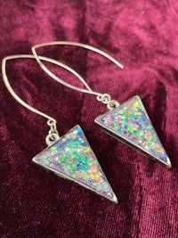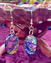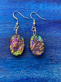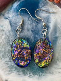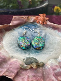 Dicro is a term used in glass blowing to signify the beautiful sparkly, color shifting glass. Here the Dicro method is mimicked with color shifting papers and resin to create these iridescent, opalescent combination of colors. Set in Sterling Silver hypoallergenic findings.