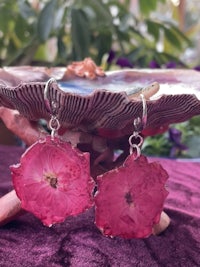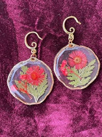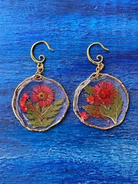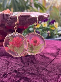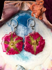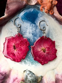 Hand dried and pressed whole rose flowers, on stylized hypoallergenic hooks. These real flowers are preserved in Resin making their ephemeral nature a little more permanent.