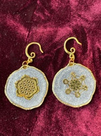 Flower of Life and Metatrons cube with a white shimmery background and a holographic back.