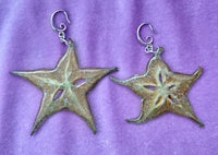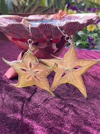 Whole slices of exotic Starfruit, Hand dried and preserved in Resin. They look so juicy and cute, like stained glass in the sun. Set in Silver hypoallergenic findings.