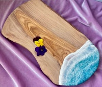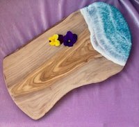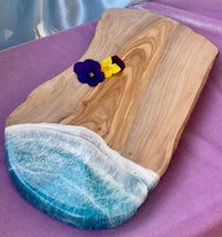 Hand poured Resin ocean waves on Tunisian Olive Wood cutting board with beautiful love edges.