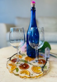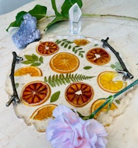 Made with real Orange and Blood Orange slices,( hand dried by me), a few delicate leaves featuring a fern and a four leaf clover, finished with a hint of opalescent sparkles. Set in clear, premium, durable, non-toxic Epoxy Resin and is heat safe up to 500 F.