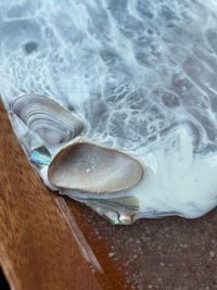 Cute upcycled vintage trinket tray made in the Philippines out of Kamam wood. Filled with a Resin ocean scene featuring pink sand beach, abalone shells and shells from my hometown Long Beach, CA.