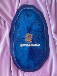 Deep sapphire blue oval tray accented with Mushroom Holographic Foil, Gold Foils and a fern leaf.