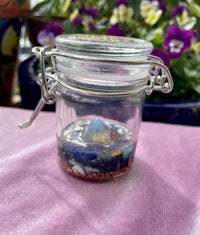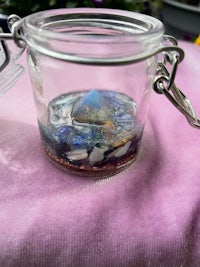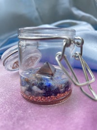 I wanted to add crystals and copper to a glass, airtight jar so the contents held within could be cleared of low vibrations and charged up with the good, high, crystalline vibes and so this Orgonite stash jar was born!