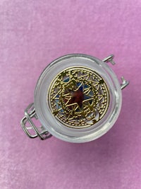 This little jar is topped with a Mahogany Obsidian Mushroom and a Gold Moon and Star portal decal on the lid.