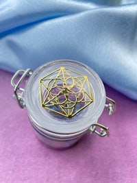 This little jar is topped with a Tigers Eye pyramid and a Gold Merkaba and Flower of Life decal on the lid.